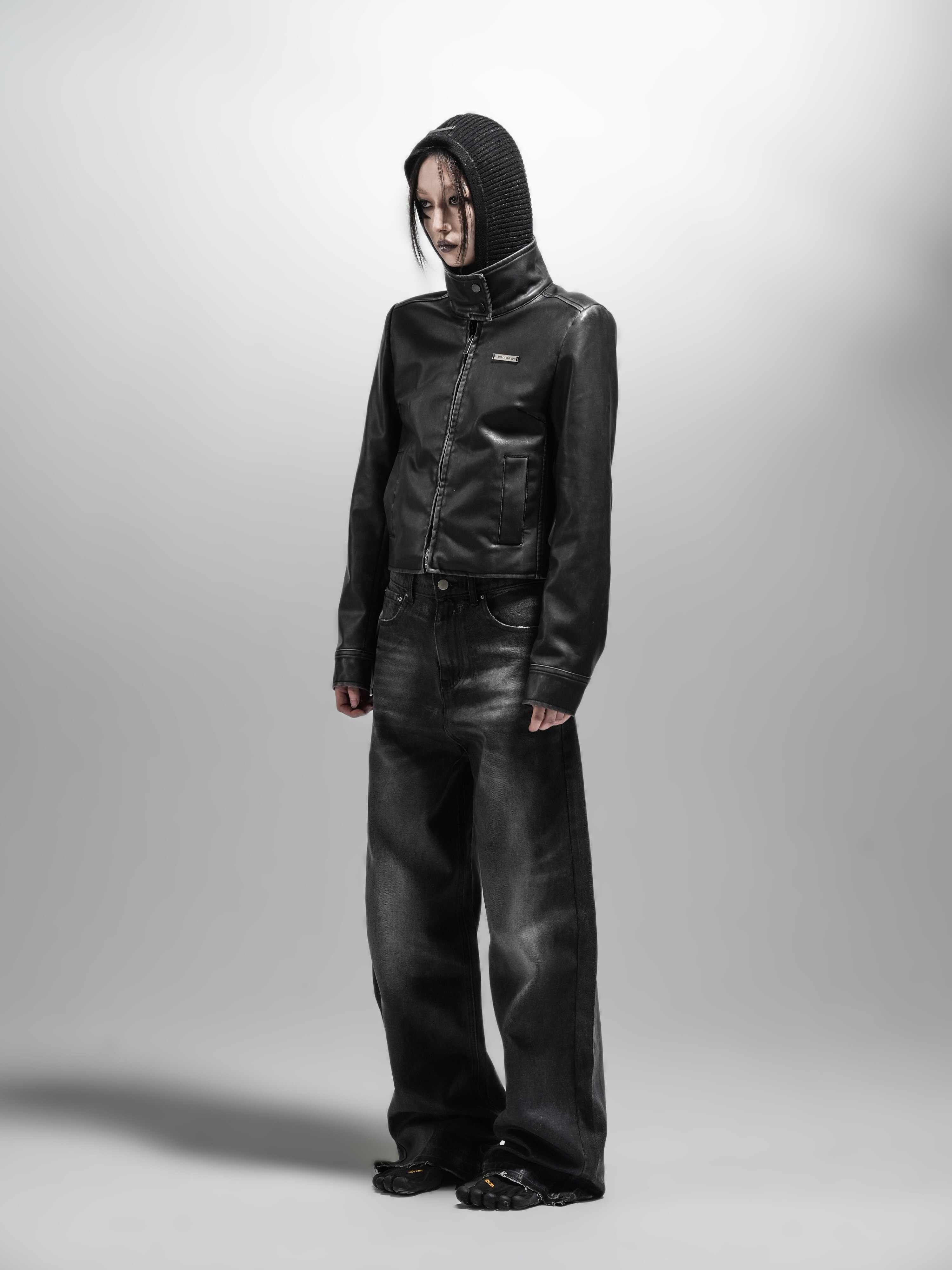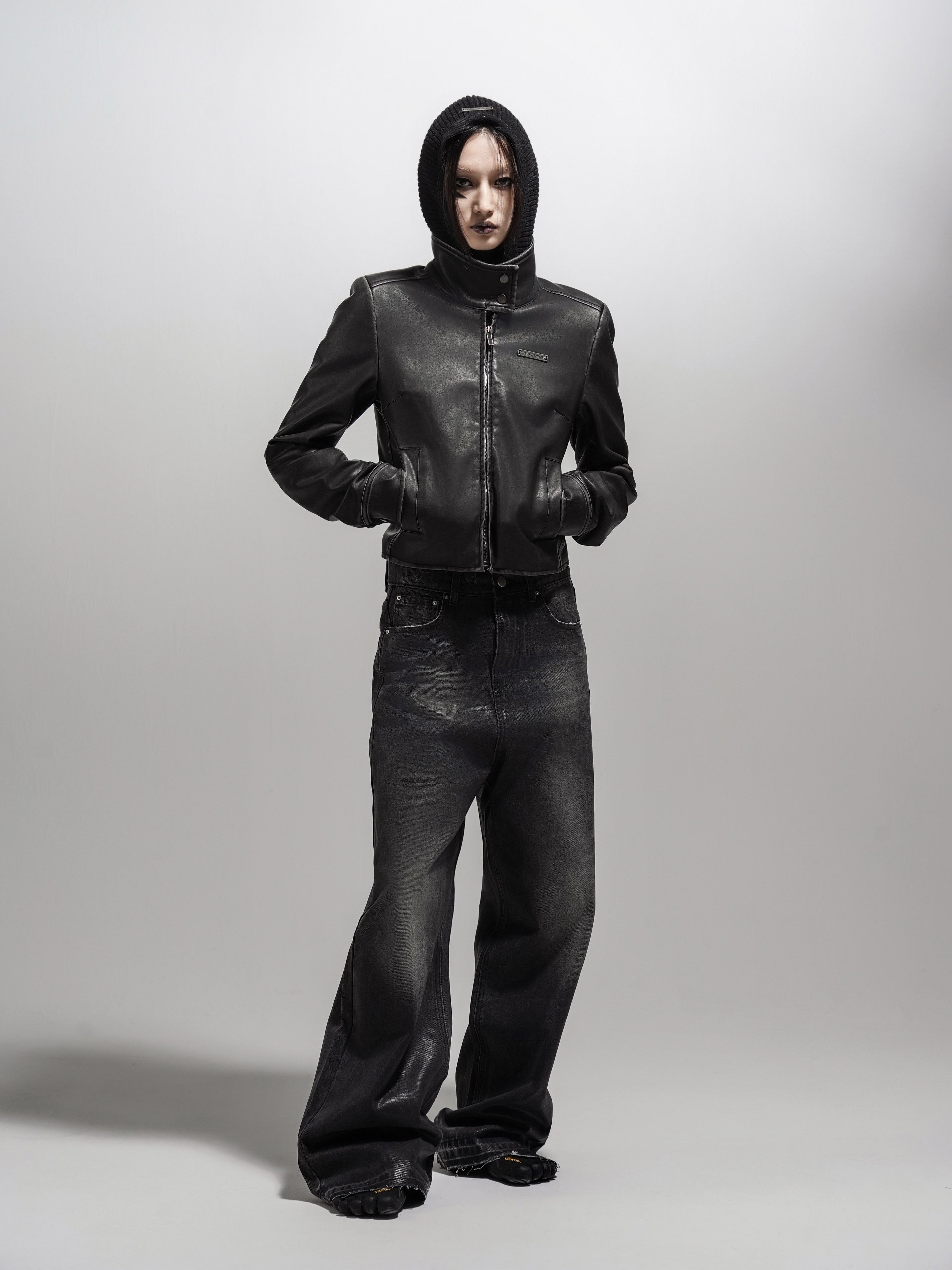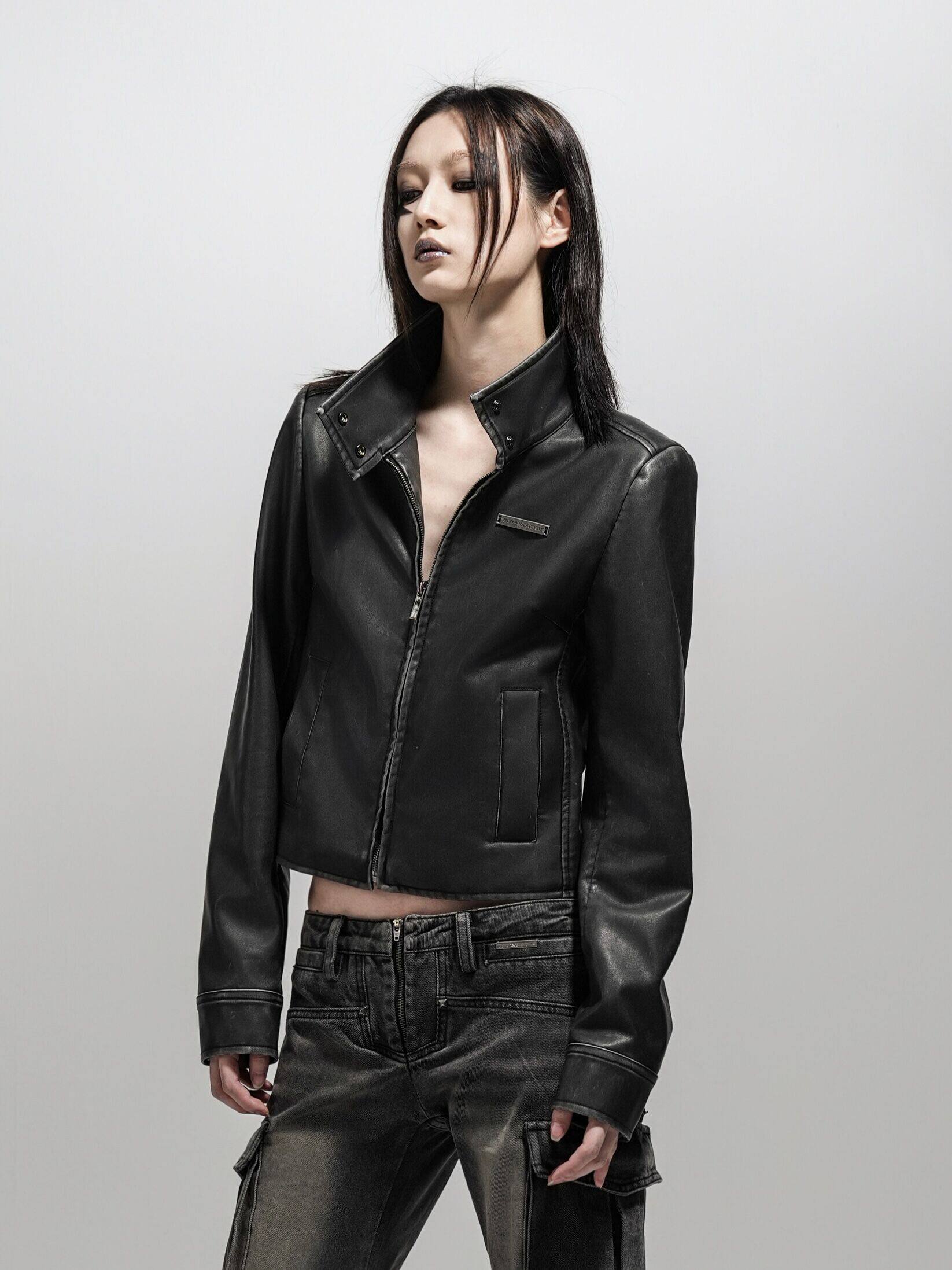 Wcoumq | Retro Washed Leather Motorcycle Jacket – Women’s Slim Fit Short Coat with Shoulder Pads for Fall & Winter
